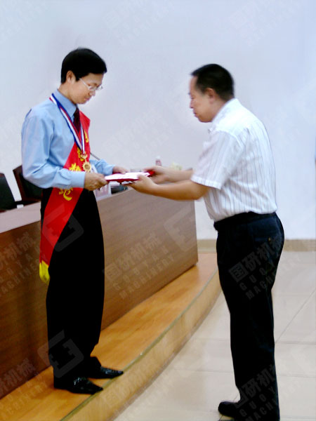公司总经理在给刘启刚颁发劳动模范证书