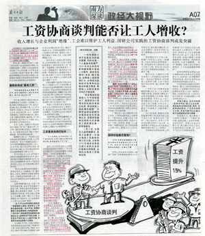 7月14日,《南方日报》以《工资协商谈判能否让工人增收?——国研公司实践的工资协商谈判或是突破》为题,用三分之二大版篇幅报道广州市U8网页版页面登录_U8(中国)设备制造有限公司实践工资集体协商的成功经验。